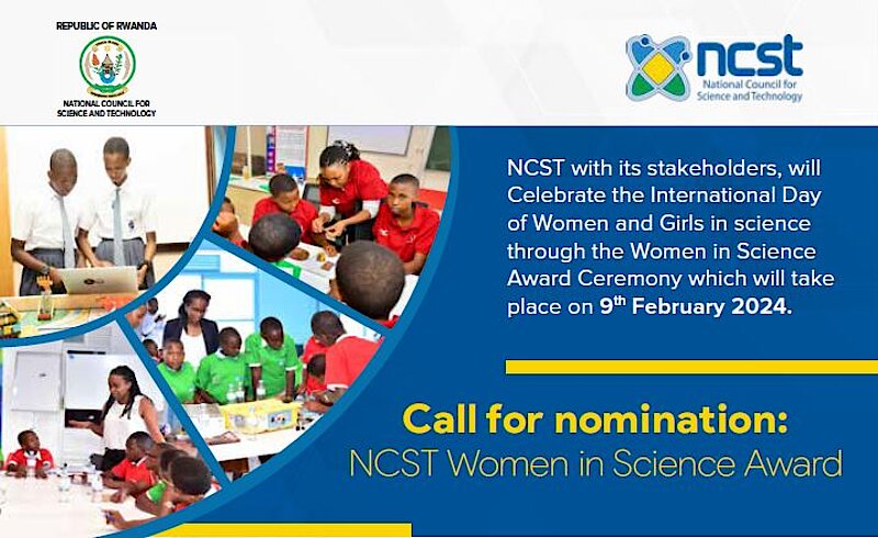 The National Council for Science and Technology (NCST) in collaboration with various stakeholders (MIGEPROF, RAWISE, MasterCard Foundation, UR, RP, AIMS, CNRU, OWSD Rwanda Chapter, and other partners wish to recognize the outstanding role of women and girls in STEM to advance science in the society. This will be done through the “NCST Women in Science Award” on the celebration of “International Day of Women and Girls in Science”. You are invited to nominate your recommended candidate latest 15th January 2024 via RIGMS for the categories 1-3, and https://rb.gy/6jvsp2 for category 4.