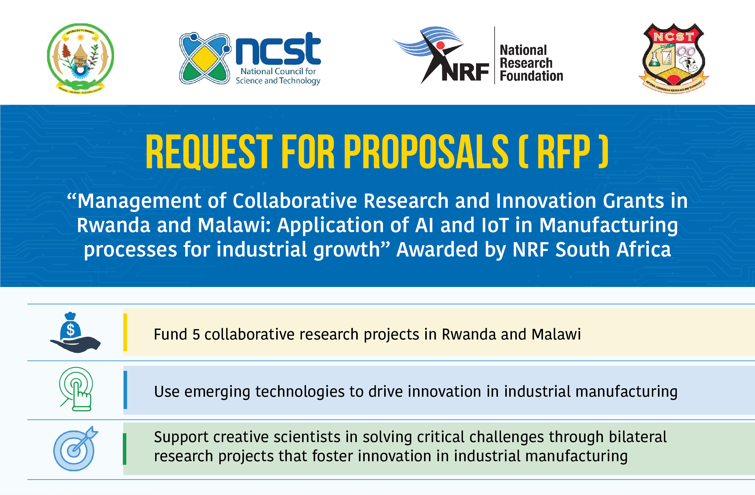 The purpose of this grant is to provide funding to researchers and innovators to carry out collaborative research in Rwanda and Malawi; broadening opportunities for collaboration between academia and private sector focusing on use of emerging technologies for discovery and innovation towards manufacturing and industrialization in Malawi and Rwanda. The main Goal is to support the most creative scientists in Rwanda and Malawi to implement research that fosters innovation and promotes collaboration in solving the most critical development challenges in Rwanda and Malawi.