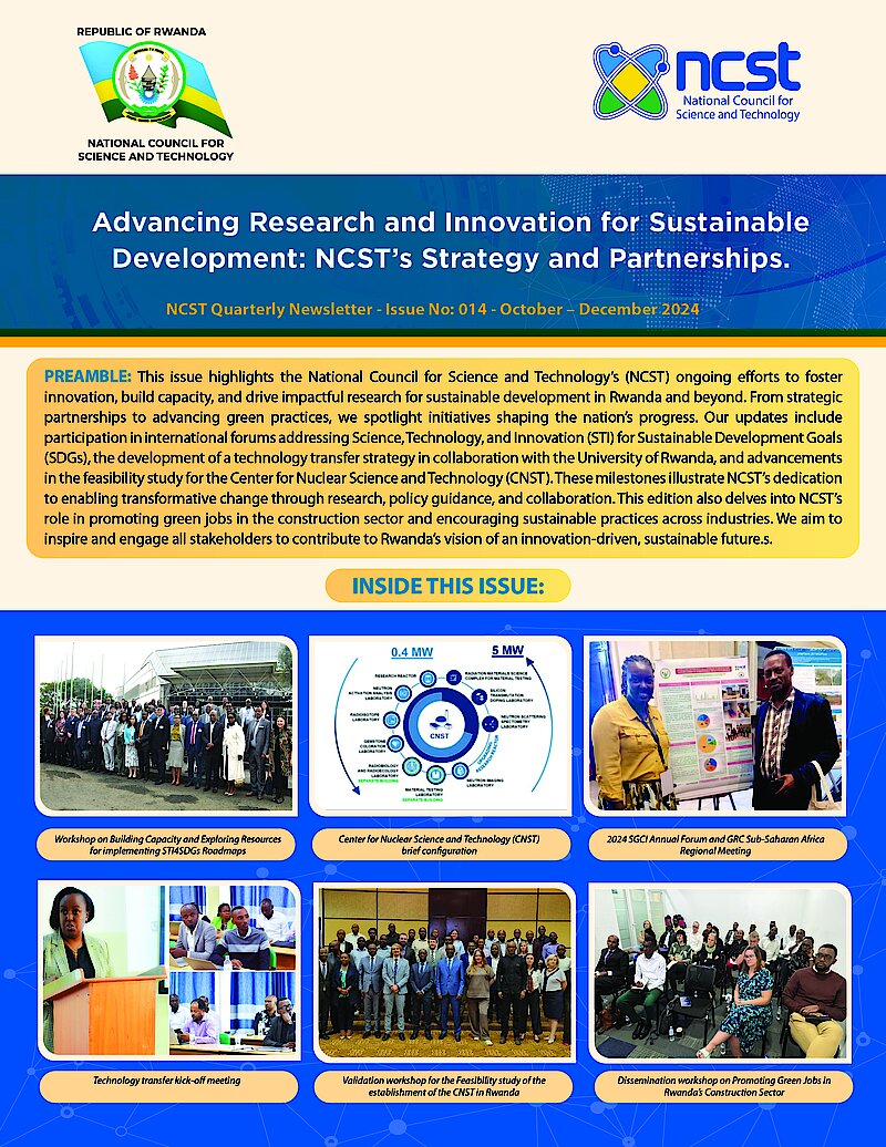 This issue highlights the National Council for Science and Technology’s (NCST) ongoing efforts to foster innovation, build capacity, and drive impactful research for sustainable development in Rwanda and beyond. From strategic partnerships to advancing green practices, we spotlight initiatives shaping the nation’s progress. Our updates include participation in international forums addressing Science, Technology, and Innovation (STI) for Sustainable Development Goals (SDGs), the development of a technology transfer strategy in collaboration with the University of Rwanda, and advancements in the feasibility study for the Center for Nuclear Science and Technology (CNST). These milestones illustrate NCST’s dedication to enabling transformative change through research, policy guidance, and collaboration. This edition also delves into NCST’s role in promoting green jobs in the construction sector and encouraging sustainable practices across industries. We aim to inspire and engage all stakeholders to contribute to Rwanda’s vision of an innovation-driven, sustainable future.