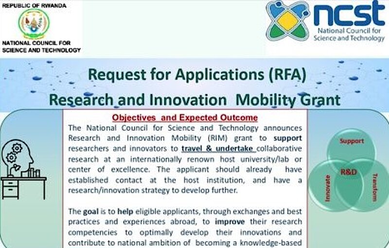 The National Council for Science and Technology (NCST) is pleased to announce a call for proposals for Research and Innovation Mobility (RIM) Grant to support researchers and innovators with transformative research and innovation, to travel and undertake collaborative research at an internationally renowned host university/lab or center of excellence.