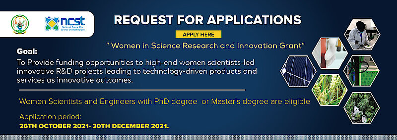 In order to promote Rwandan women scientists’ leadership and their effective participation in national research performance and productivity, leading to the development and uptake of technology driven innovation that address specific community needs for the well-being of Rwandan population, NCST is pleased to announce its first call for research proposals under the “Women in Science Research and Innovation Grant”. This grant scheme is designed to foster demand-led collaborative research projects that are proven to be technology-driven innovation projects.